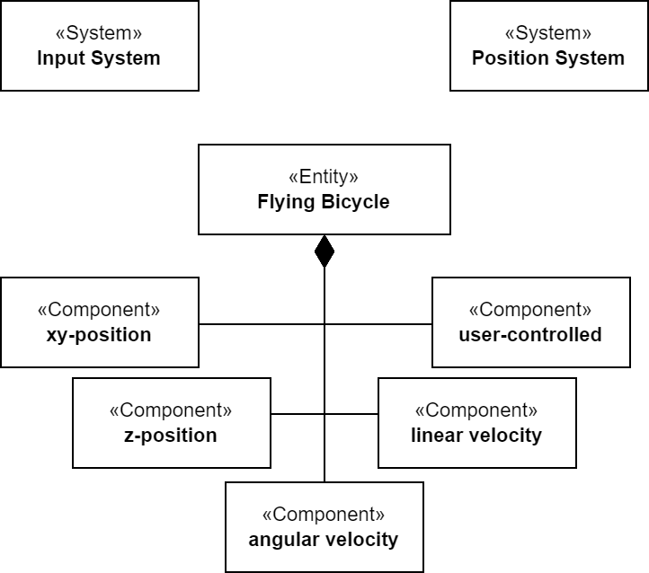 Using the ECS pattern, a vehicle entity could be modeled by composing it with desired components. Figure 2 shows how this can be done. An Input System would process entities with the user-controlled and linear velocity components. A different system could be defined that acts on entities also composed of the angular velocity component, but the input system could also provide additional logic when this component is present. Finally, the Position System would act upon every entity with a velocity and position component, and calculate the new positions.