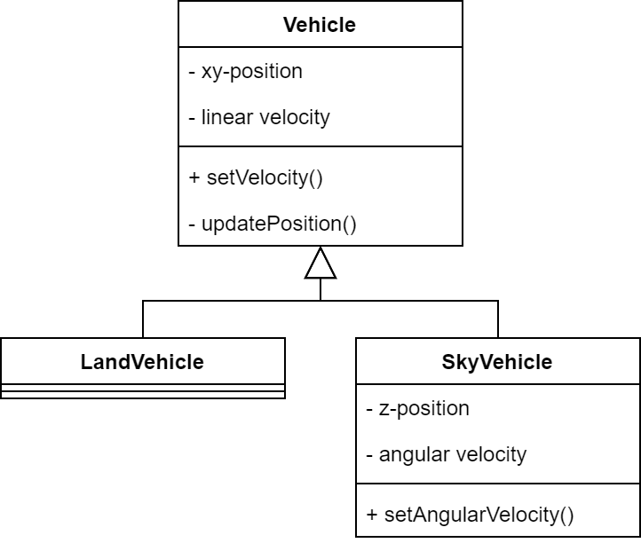 To clarify the differences between classical OOP and use of the ECS pattern, we provide a small example. Figure 1 shows a simple class diagram that could be used to define different vehicles. The specialized classes LandVehicle and SkyVehicle inherit properties and methods from the Vehicle class. Each specialization might provide different implementations for the indicated methods as the way in which this is performed might differ. Further specialized classes could differentiate helicopters from airplanes and cars from bicycles. Similarly to actuation in a Digital Twin system, assume that an external actor controls the vehicles velocity. The public methods represent user controlled actions, while the updatePosition() method represents some logic that continuously updates the position of the vehicle based on its velocity and current position.